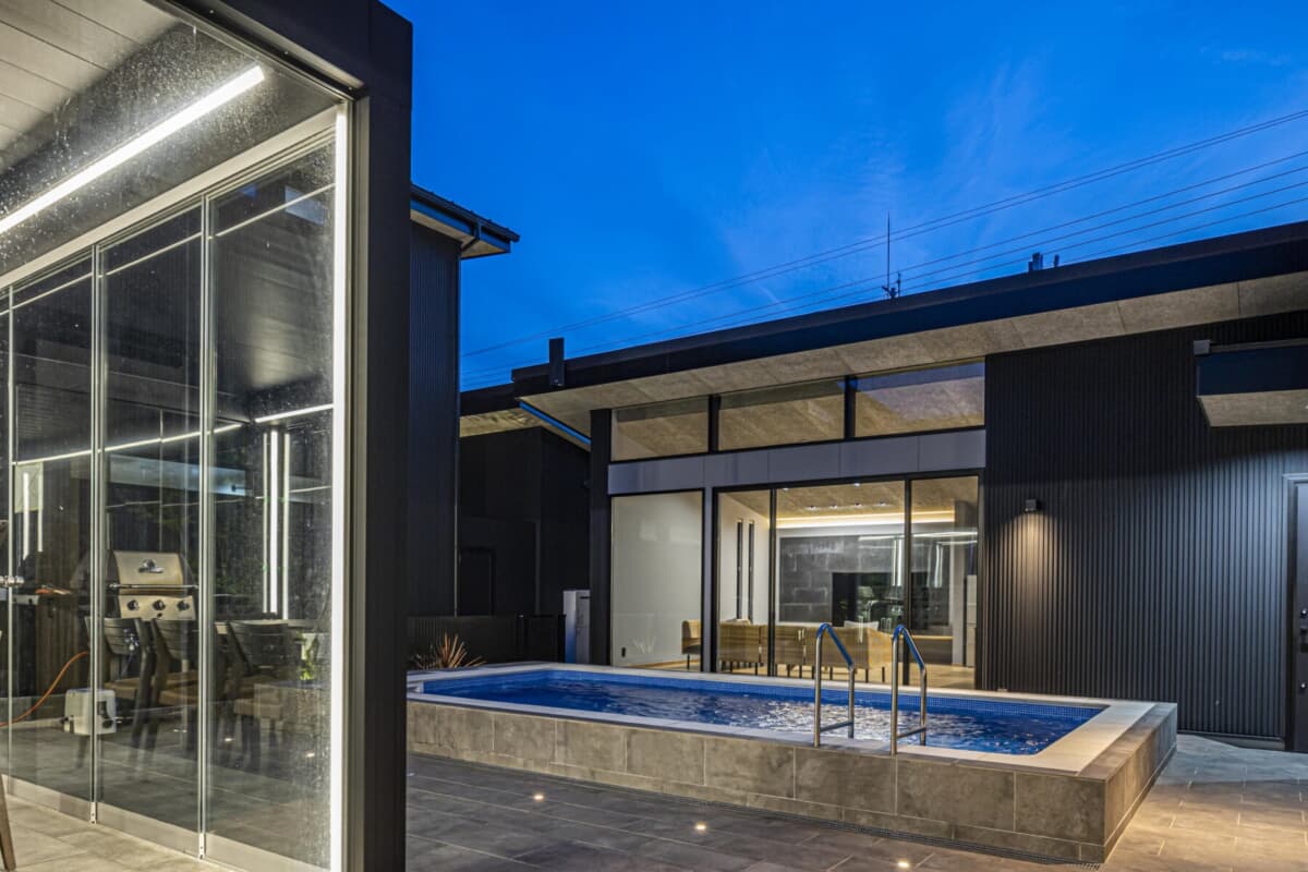 プールサイドには、雨や風を遮りながらも視界は遮らない全面ガラス張りのBBQスペース「ヒカリのテラス」を設置。