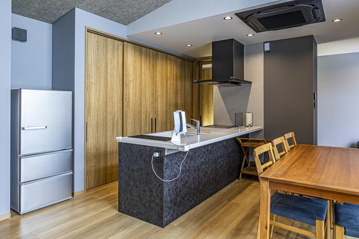 調理器具 | フライパン、片手鍋、電子レンジ、電気ケトル、炊飯器、食器(大皿、中皿、小皿)、グラス(グラス、コーヒーカップ)、包丁、まな板、お箸、スプーン(大・小)、フォーク(大・小)、ディナーナイフ、栓抜き |